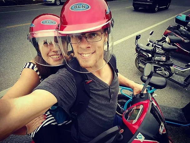 (we may drive against traffic like the locals, but we make sure to wear helmets!)
