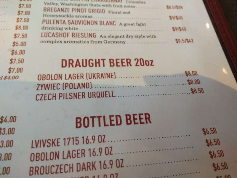 If you prefer dessert in a liquid form, there’s also a lot to choose from. As a Ukrainian-Czech I always struggle between picking draft Obolon Lager from Lviv and Pilsner Urquel from Plzen. To make things harder, they have a New York beer on tap as well. If this isn’t enough, they have many options of bottled beer and wine.