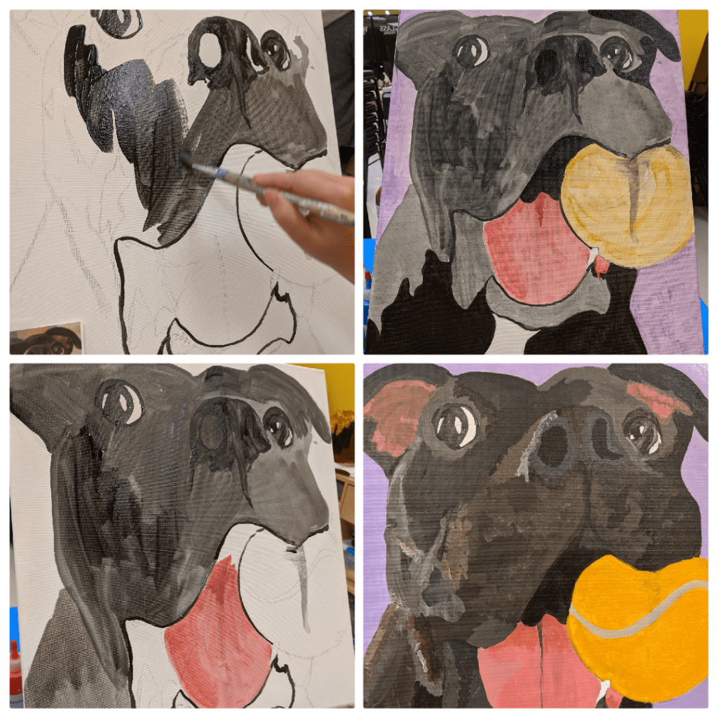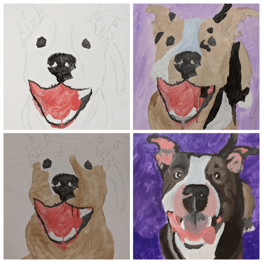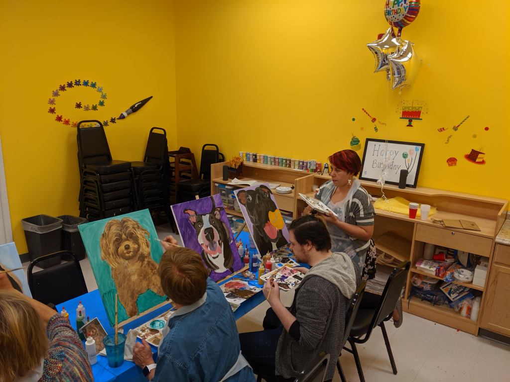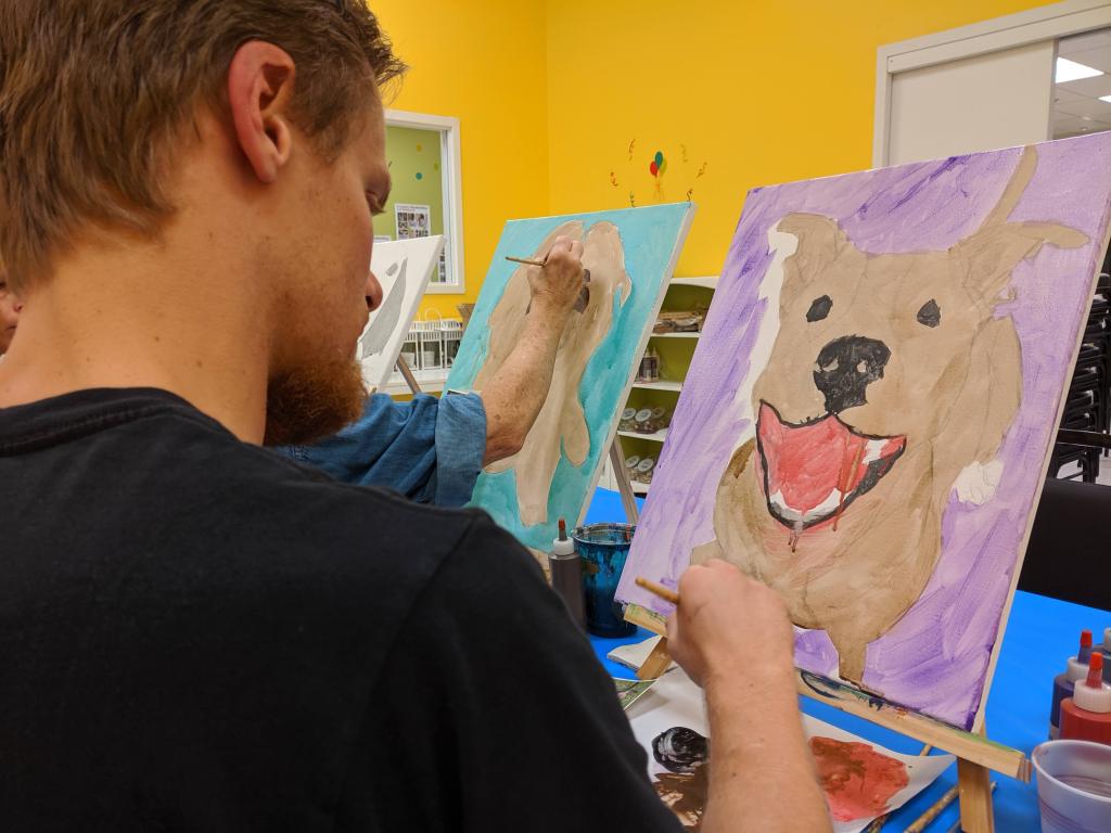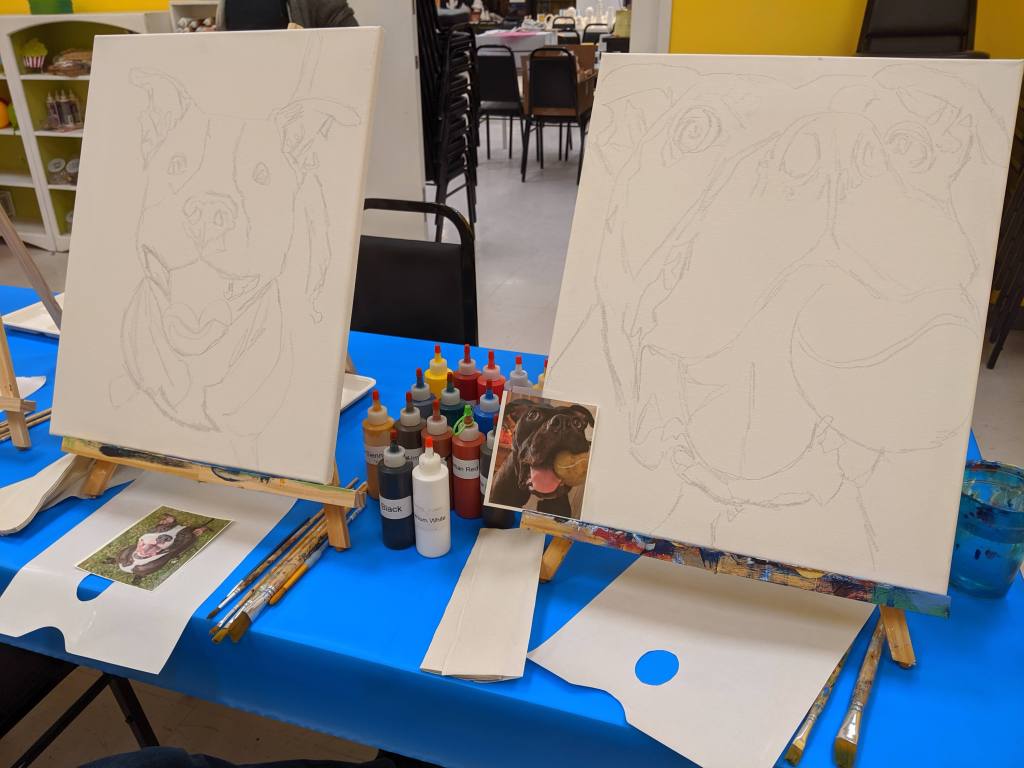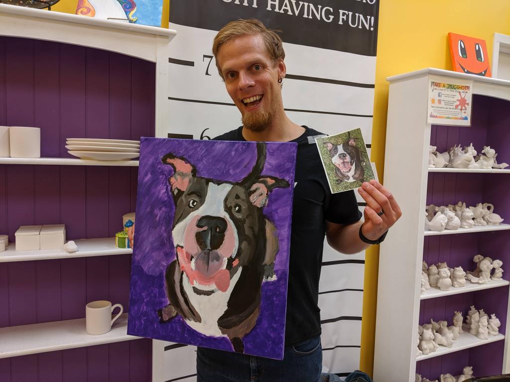 This Paint Your Pet class was actually taught by her son Dylan, an art school graduate and amazing painter. Before arriving at the class, we all had to send in our pet photos so that he could sketch them on the canvas. As I previously mentioned, ANYONE can achieve a great paining of their pet here. They set you up to succeed!