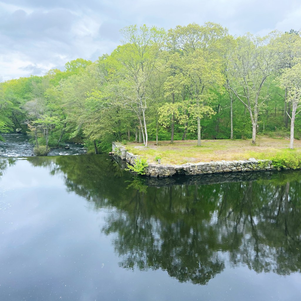 We are lucky because the path is just over half a mile (1km) from our home in West Warwick. The section we entered was the Washington secondary bike path and then we headed West towards Connecticut. Even though we could hear the nearby road and traffic for the first few miles, it looked exactly like a paved path in a forest. The Pawtuxet River flowed alongside the path until we reached a large bridge overlooking the river.