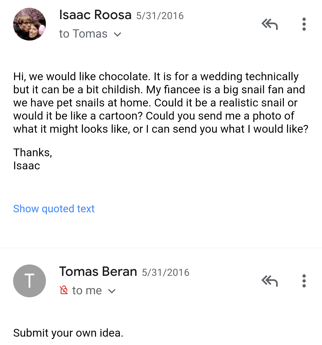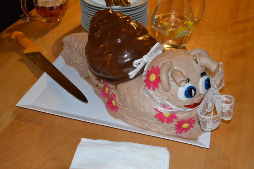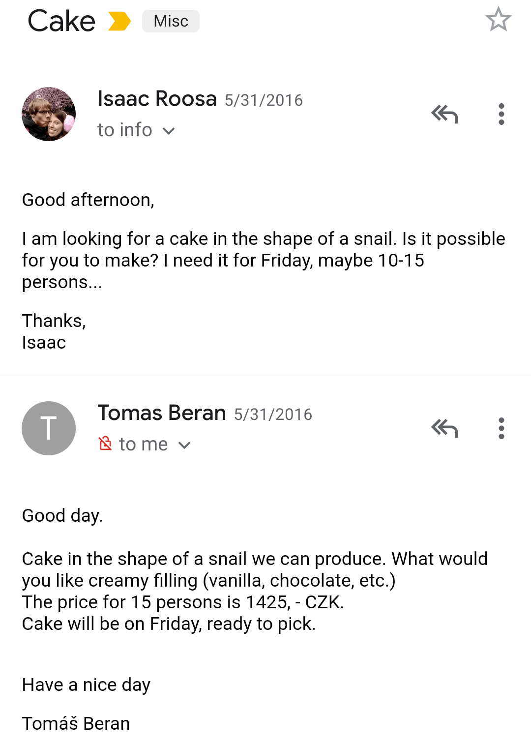 This is where I picture poor Thomas wondering if he was confusing the meaning of the word snail. Doing a google search and saying yup, they want a hlemýžď cake… this must be a prank….