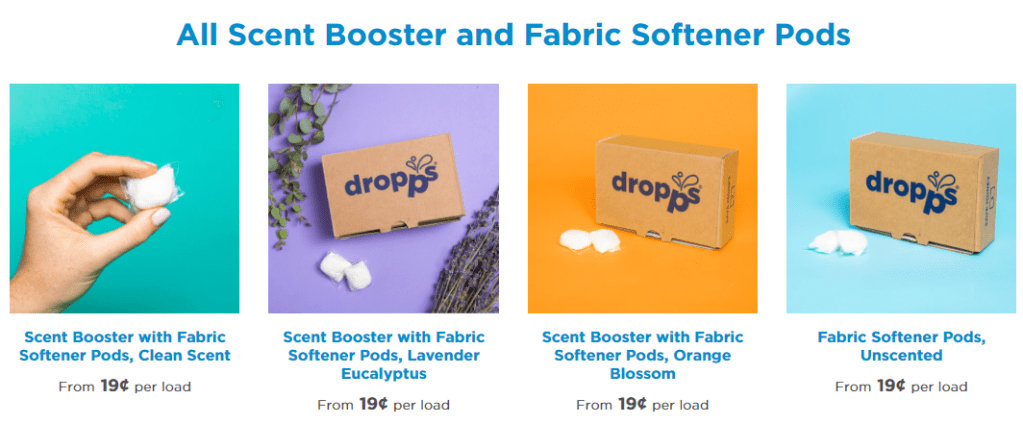 Dropps not only offers regular detergent pods, they also have fabric softener ones and they have other products based on a variety of needs. They have special pods for smaller loads, scent booster pods, oxi booster pods, dish detergent pods as well as odor defense spray and laundry bags/dryer balls. Dropps also offers pods that are fragrance free, for sensitive skin, for baby clothes and a stain and odor remover.