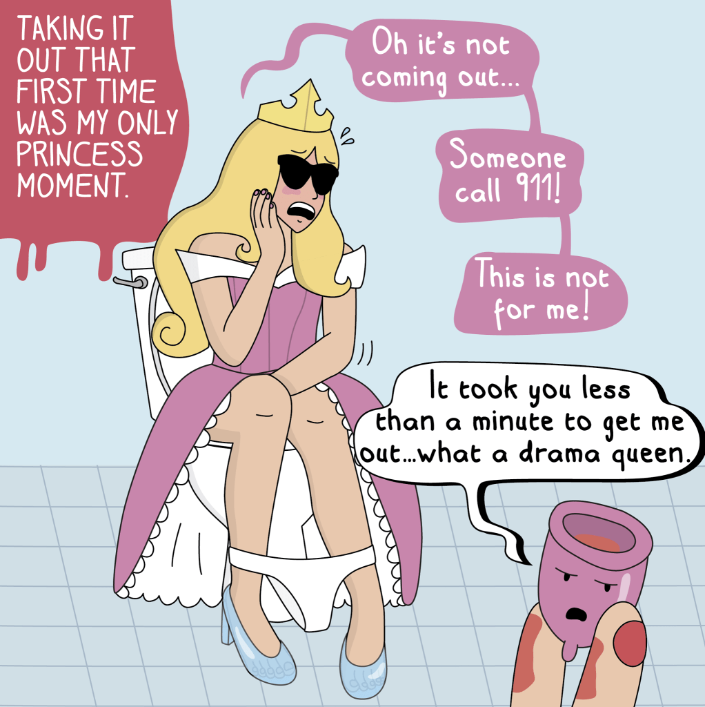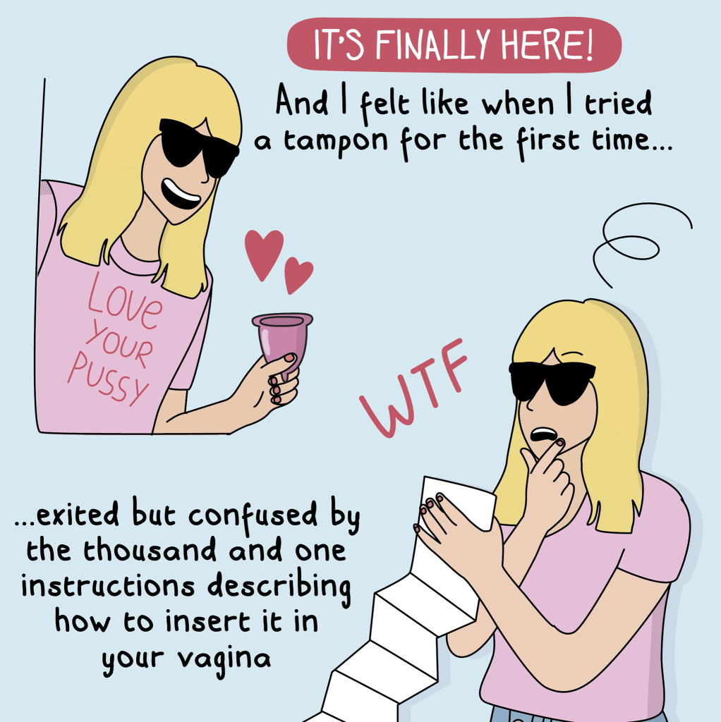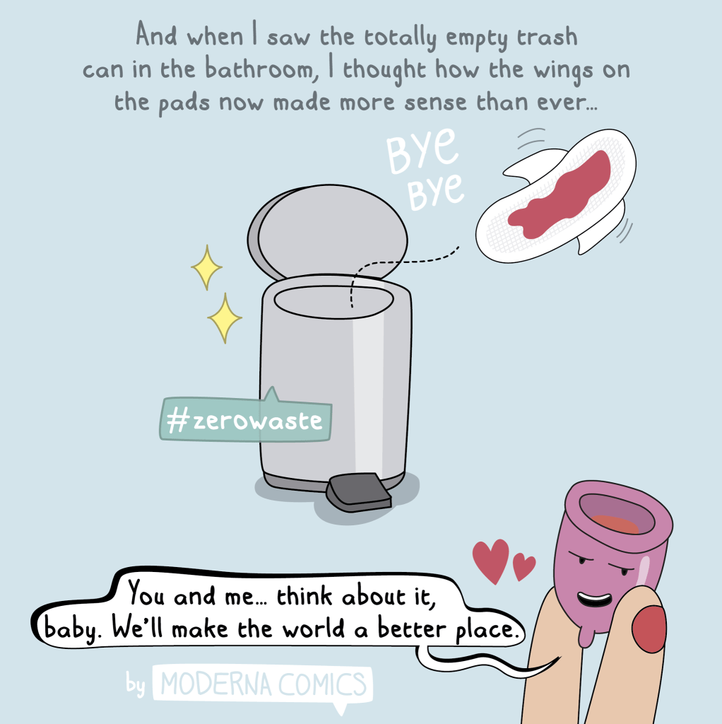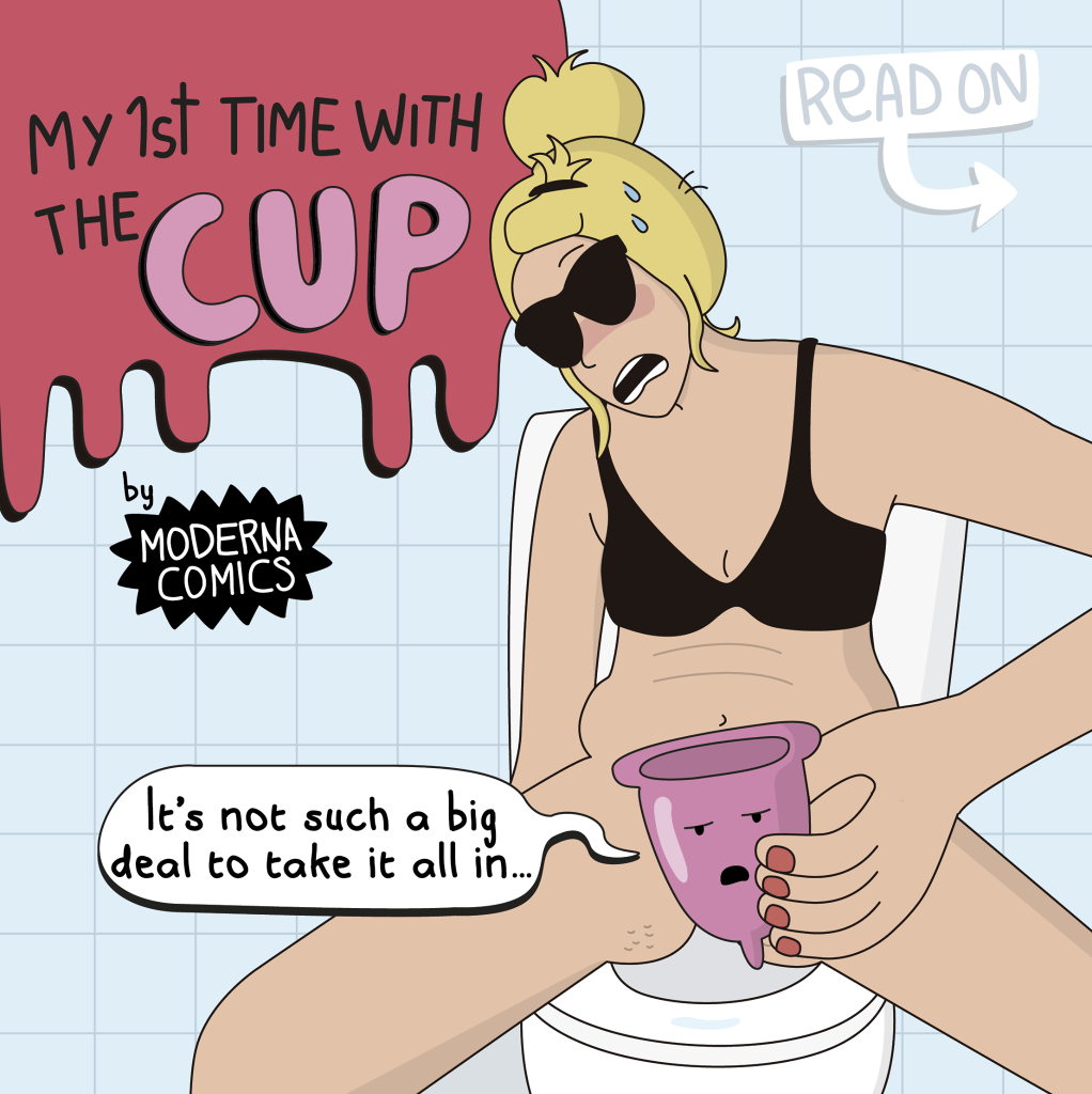 There are many different menstrual cups out there, but personally I would try the FLEX cup. It has an easy to grip stem that makes it possible to drain the cup without removing it. However, please check out this list of different options. One cup does not fit all! I found this great cartoon on Facebook – Moderna Comics. I questioned including these on here, but its 2020 and are way overdue for normalizing a perfectly natural bodily function.