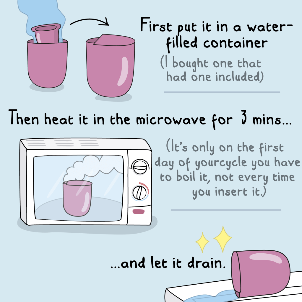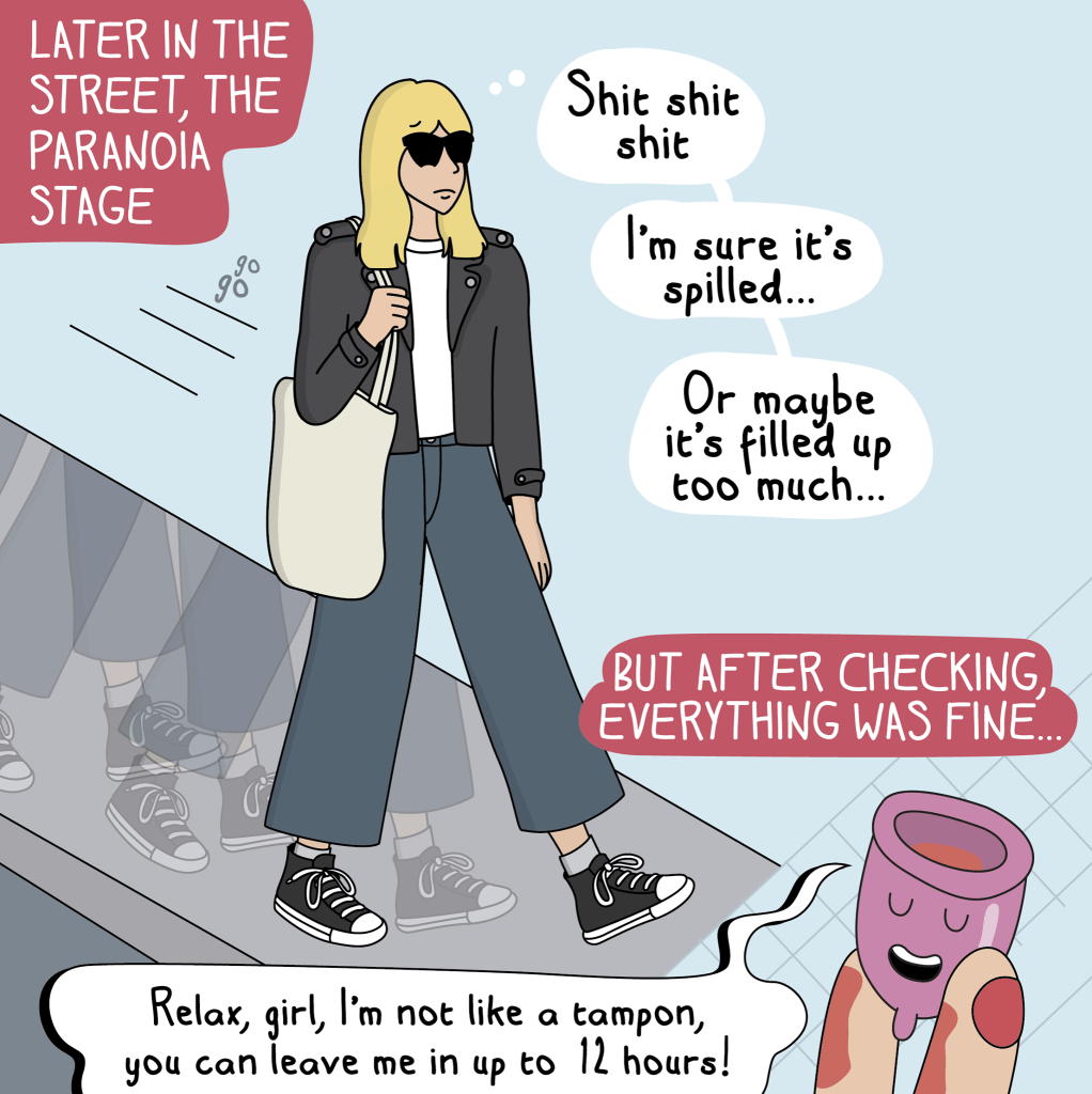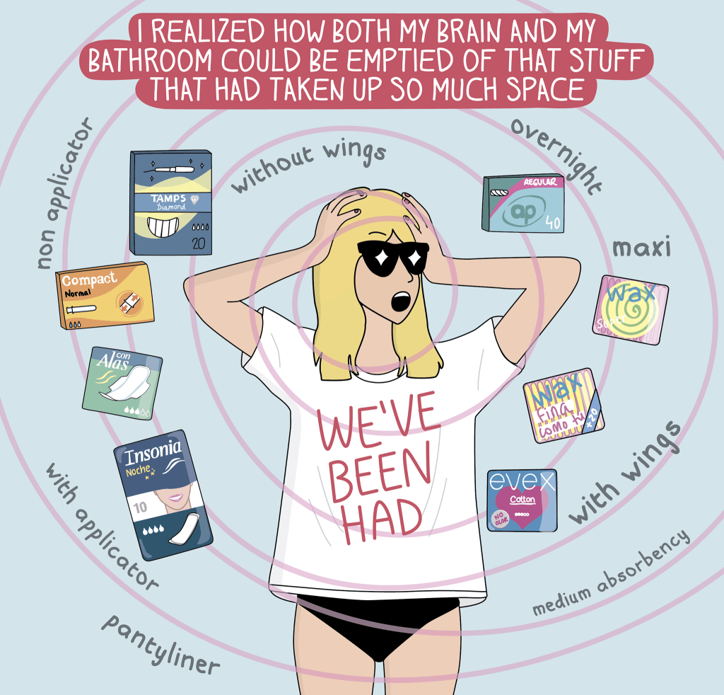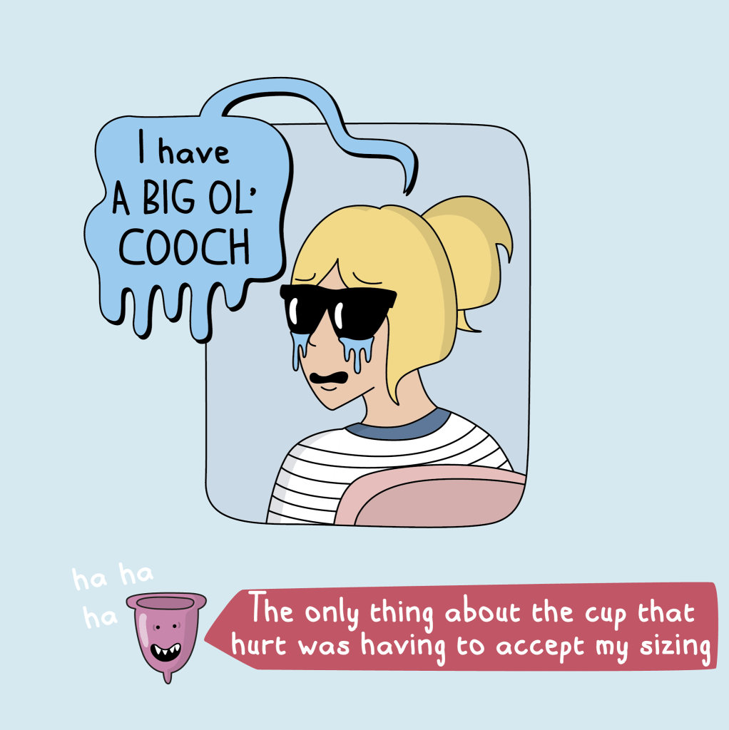 There are many different menstrual cups out there, but personally I would try the FLEX cup. It has an easy to grip stem that makes it possible to drain the cup without removing it. However, please check out this list of different options. One cup does not fit all! I found this great cartoon on Facebook – Moderna Comics. I questioned including these on here, but its 2020 and are way overdue for normalizing a perfectly natural bodily function.