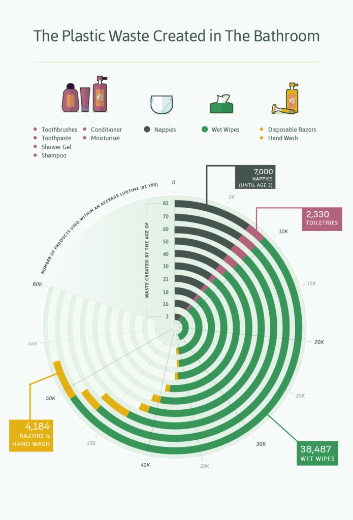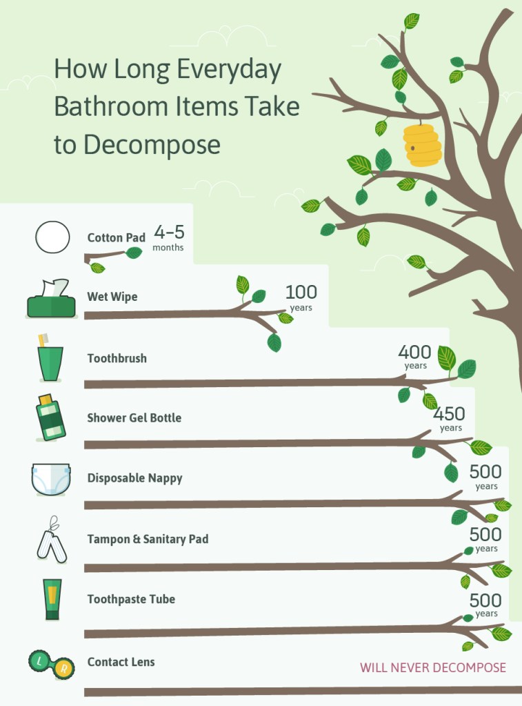 The following 15 eco-friendly bathroom products can help you make a difference on this planet! The zero-waste movement has picked up steam in the past few years. Many people now say no to straws and carry a reusable bag when shopping. It can be a lot harder to waste less when it comes to bathroom products. I found the infographics below on Circular.com. Between 30-40% of waste in landfills is bathroom products. These 15 eco-friendly bathroom products can replace them!