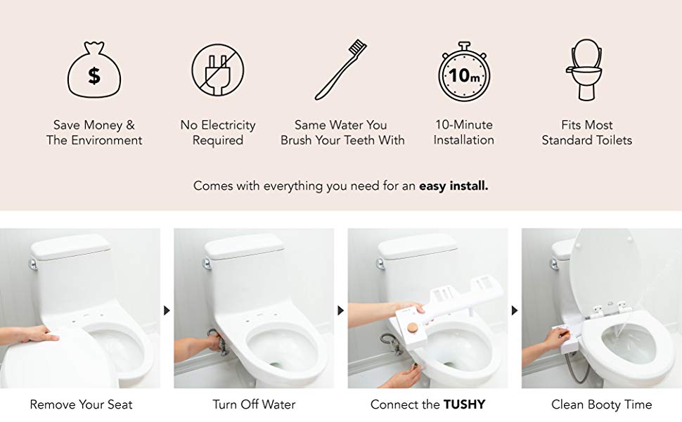Toilet paper is not environmentally friendly even when it’s of the greener, plastic-free variety. The best thing for the environment (and your butt-hole) is to use water. I am not suggesting waddling from your toilet to the shower. Many countries around the world have bidets next to their toilets. Japan has them installed in their toilet seats. That is what inspired Tushy – a company that sells a bidet attachment that you can instal to your toilet!