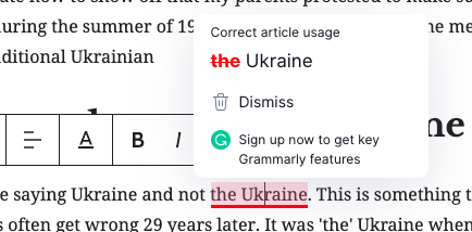Notice me saying Ukraine and not the Ukraine (thank you Grammarly!) This is something that politicians in English speaking-countries often get wrong 29 years later. It was ‘the’ Ukraine when it was a region of the USSR. On August 24th 1991, the ‘the’ was dropped and it became Ukraine.