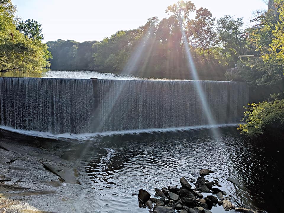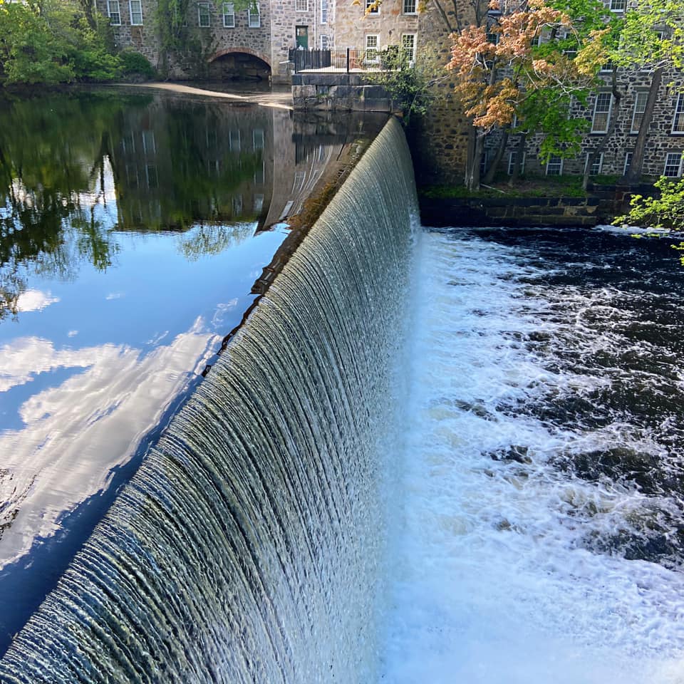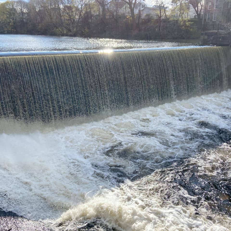 There is a waterfall in West Warwick! When I moved to this town, I was excited about the central RI location and affordable houses. A beautiful waterfall and a scenic River Walk were a great bonus! The River Walk also offers a view of the Royal Mills Riverpoint Apartments. But I’ll get to those in a minute. It can be a little complicated to figure out how to get here off of just Google, so let start by telling you exactly how to get to the waterfall in West Warwick, Rhode Island.