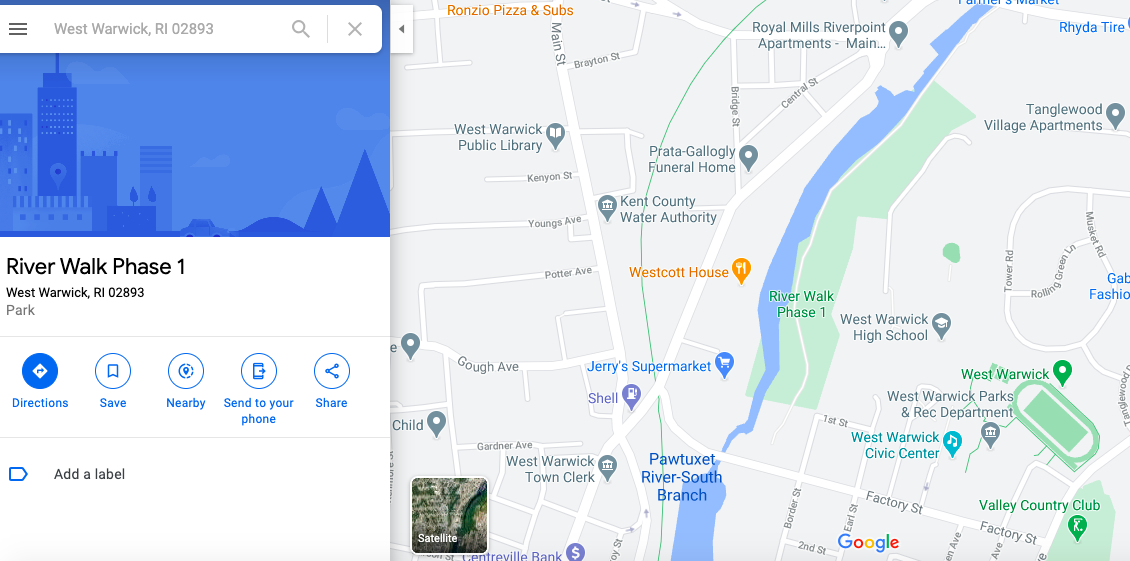 If you’re going to walk, I definitely recommend to walk by American Legion Post 2. There is a WW1 memorial with a tank and several statues. From there you should walk towards the West Warwick Police-Youth Services and you’ll already get a cool view of the Pawtuxet River. If you’re driving, go straight to the Police Station and park there. This is the only easy way to enter this dead-end walkway. It looks like people climb up and down from other areas, but if you want to stick to a path and avoid sprained ankles, this is the way to go.