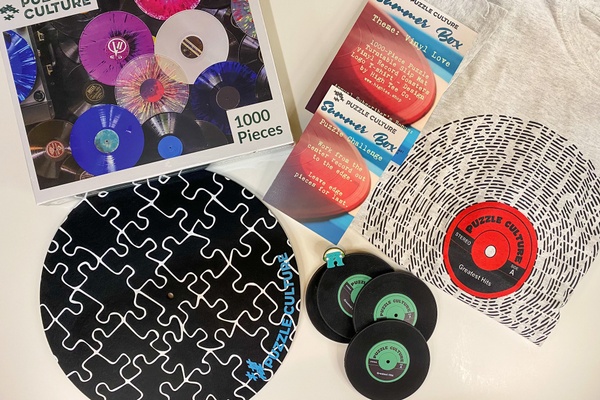 A quarterly subscription box for jigsaw puzzle fans or anyone interested in a fun screen-free activity. Each box comes with an exclusive 1000-piece puzzle you won’t find anywhere else. We will include 3-5 curated gifts that are related to the artwork theme and/or puzzle culture. Launch Box shipping in July will be the Summer Box – Vinyl Love.
