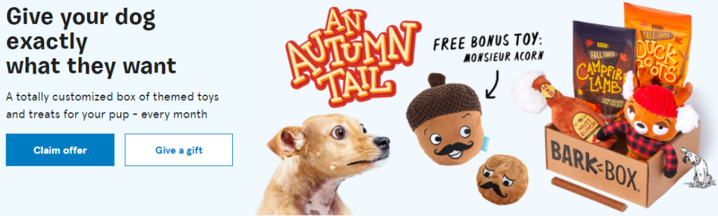 Fine, I should mention BarkBox now. They offer toys and treats to dogs of various sizes and needs. They can help customize your box based on allergies and chewing capacity. Their monthly themes are fun and exciting, both my dogs go absolutely crazy for them! If you want to read more about them, check out my article here.