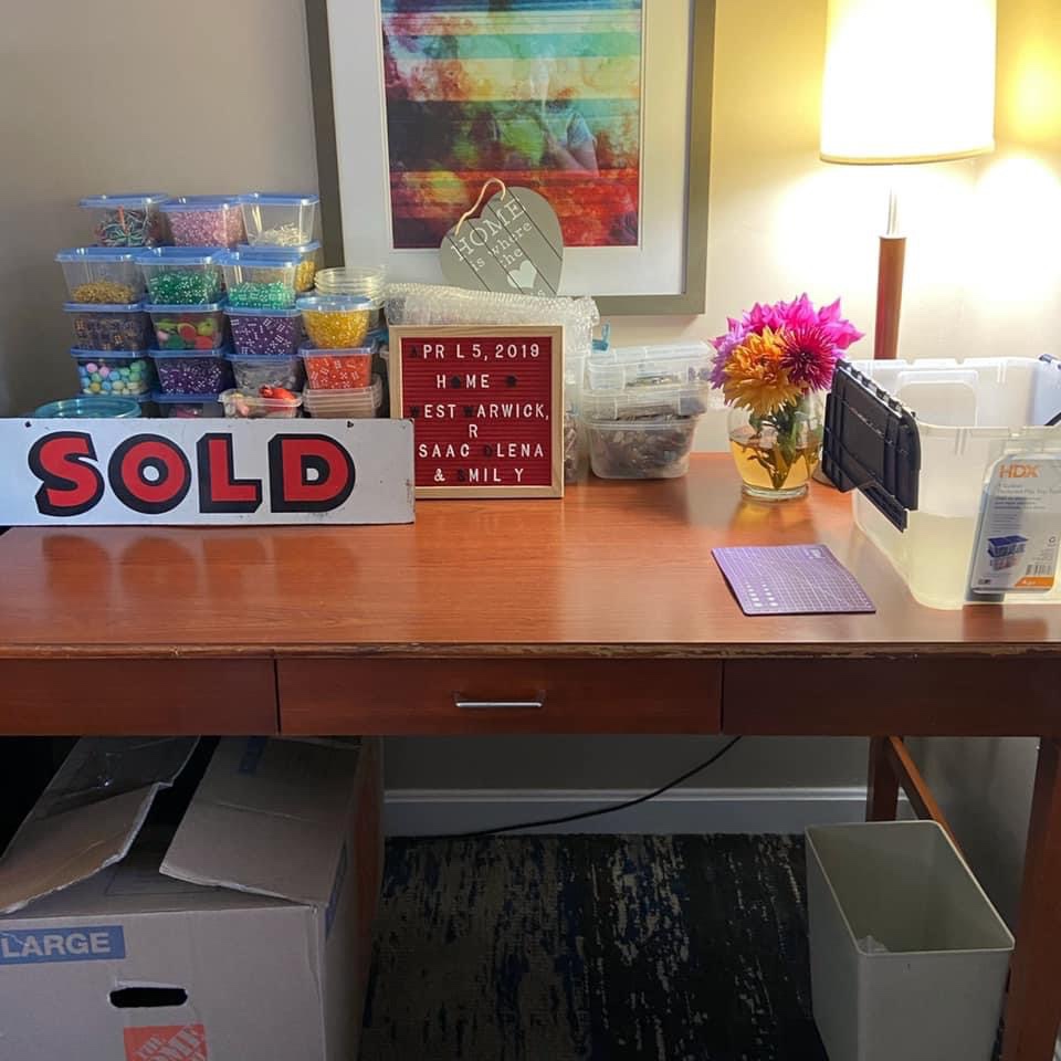 All this needs to be set up for easy access since we currently get an average of 20 orders a day. Of course, I also have a small toolbox for hooks, earring backs and loops as well as a giant box of envelopes and bubblewrap. Then there’s the 10 boxes that all of it came in, stacked up in the corner ready for us to repack on Monday.