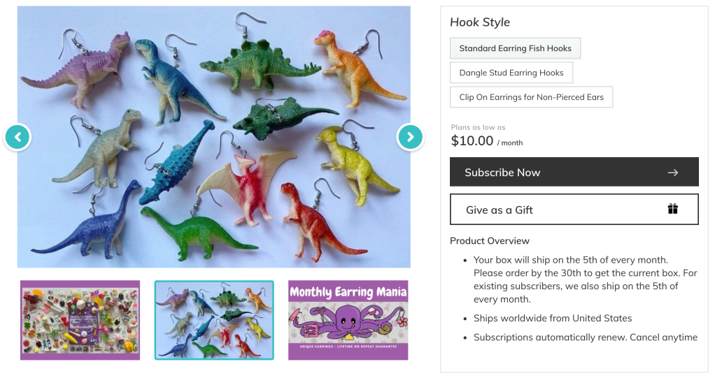 The idea behind a subscription box is that you pay in advance for a certain amount of time. Then, every month, you receive a box of goods! In the case of Monthly Earring Mania you can subscribe for just a month. If you don’t cancel the subscription, you will be auto-charged for a box. Don’t worry, if you are paying on a monthly basis and decide that you don’t want another, I will refund you as long as the box hasn’t shipped yet! I also offer pre-paid subscriptions of three months, six months and a year.