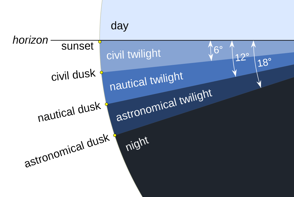 Sunset is distinct from twilight, which is divided into three stages, the first being civil twilight, which begins once the Sun has disappeared below the horizon, and continues until it descends to 6 degrees below the horizon; the second phase is nautical twilight, between 6 and 12 degrees below the horizon; and the third is astronomical twilight, which is the period when the Sun is between 12 and 18 degrees below the horizon. Dusk is at the very end of astronomical twilight, and is the darkest moment of twilight just before night. Night occurs when the Sun reaches 18 degrees below the horizon and no longer illuminates the sky.”