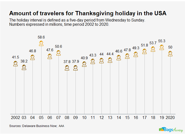 Similarly to Golden Week in China, Thanksgiving sees a record number of Americans travel for the holiday. A recent survey by TripAdvisor indicates that 70% of Americans traveled for Thanksgiving! While most travel by car, around 11% fly to their destination. Here is a chart showing the numbers over the years including 2020 predictions.