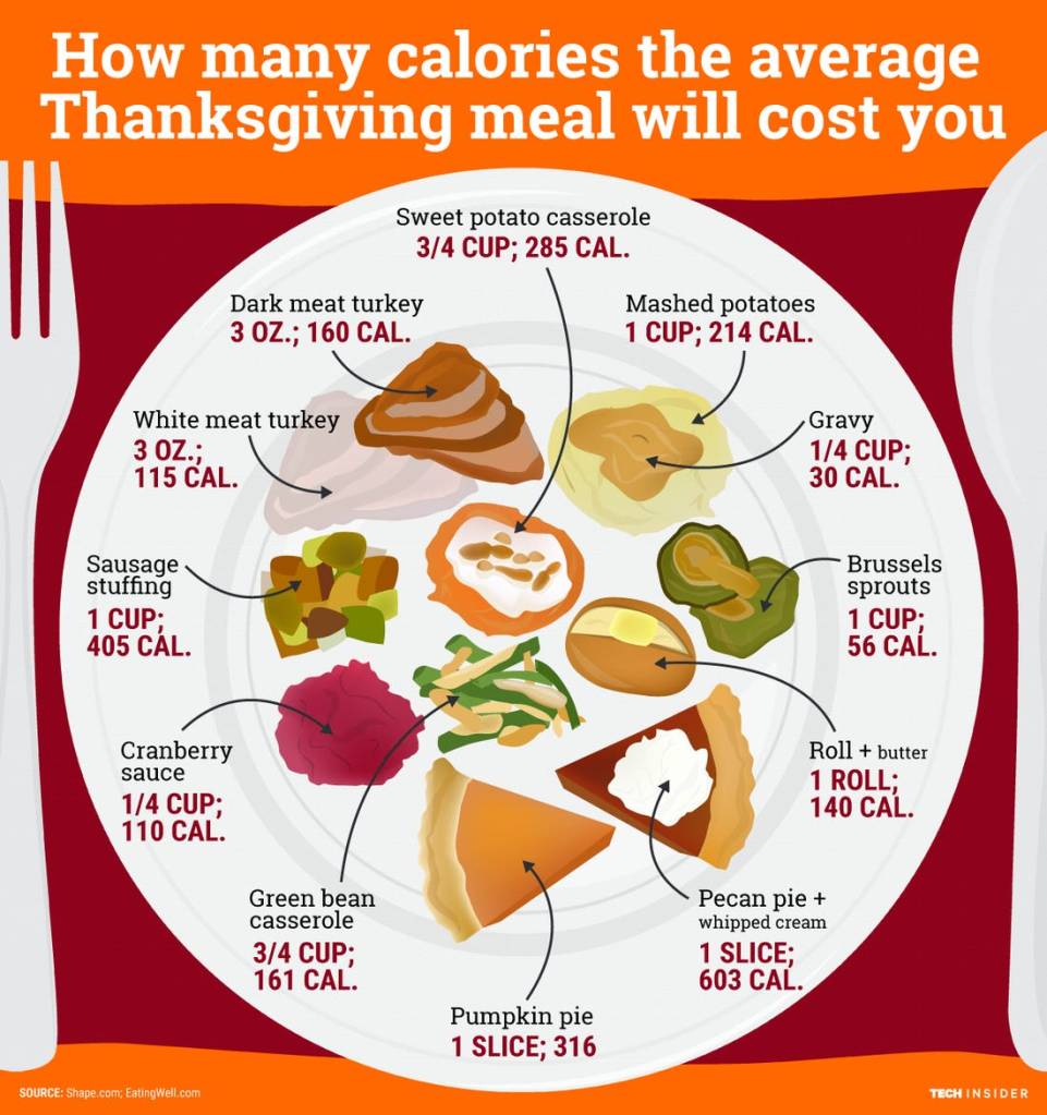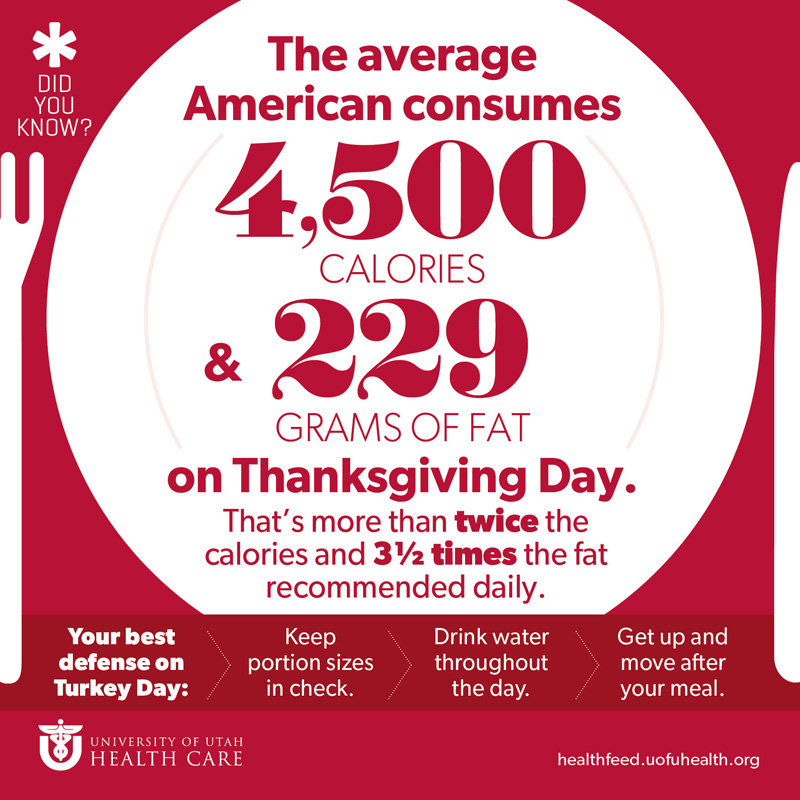 An average American male will need to spend 10 hours and 33 minutes on the treadmill to burn off the average Thanksgiving meal. Even crazier is the fact that the average person will consume 4,500 calories during one Thanksgiving meal! The recommended daily amount for the average person is 2,000 per day!