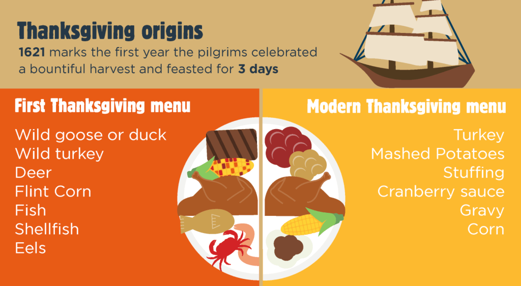 Today a classic Thanksgiving menu includes turkey, mashed potato, stuffing, cranberry sauce, gravy and corn (come at me corn haters.) However originally, people ate wild goose or duck along with wild turkey as well as deer, flint corn, fish, shellfish and eels. Of course today there are various alternatives and many meatless options for Thanksgiving if animal products don’t float your boat.