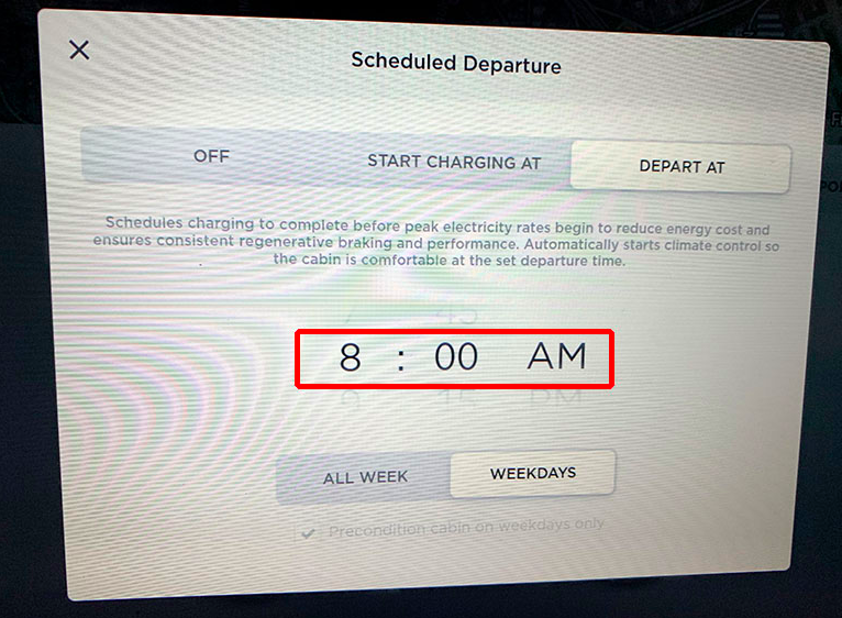 A newer and underrated feature allows you to schedule the charging of your car. When you plug your car in, the screen will have a āScheduleā button that allows you to choose the time you plan on departing. This has a myriad benefits: