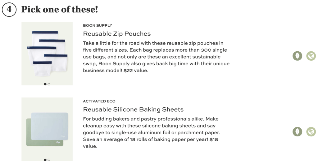 I spend more time storing food than baking, so this was another easy choice. I picked the Reusable Zip Pouches, although the Reusable Silicone Baking Sheets are genius if you’re into baking.