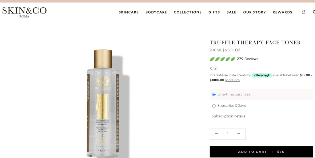 I found it on SKIN&CO easily. The toner is gentle, powerful, soothing, and healing. Truffle Therapy Face Toner deeply cleanses and purifies pores with the antiseptic power of Witch Hazel and Sage, effectively removing impurities, clogged pores and dead skin cells to treat, heal, and prevent blemishes. The natural extracts and antioxidant properties of Black Winter Truffle, Rosemary, Calendula, and Cucumber soothes and protects from environmental and free radical damage.