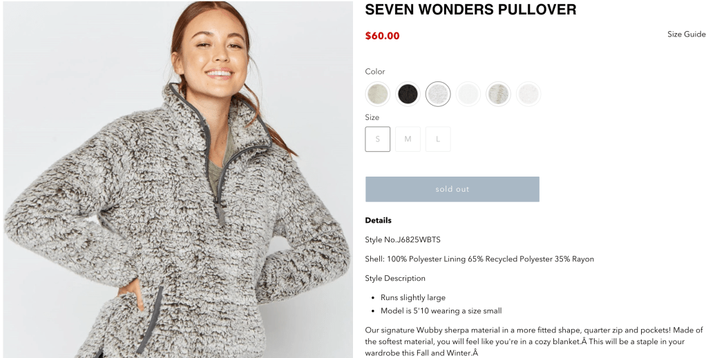 I couldn’t find the Cozy Cloud Wrap on Thread & Supply so I assume that it was made for CAUSEBOX. Most of their products seem to be around $50 and websites such as Poshmark are littered in used cozy products by them for $30-$40. Some of their products do cost closer to the $115 that the Cozy Cloud Wrap is supposed to cost, but most items seem to be half the price, such as this Seven Wonders Pullover.