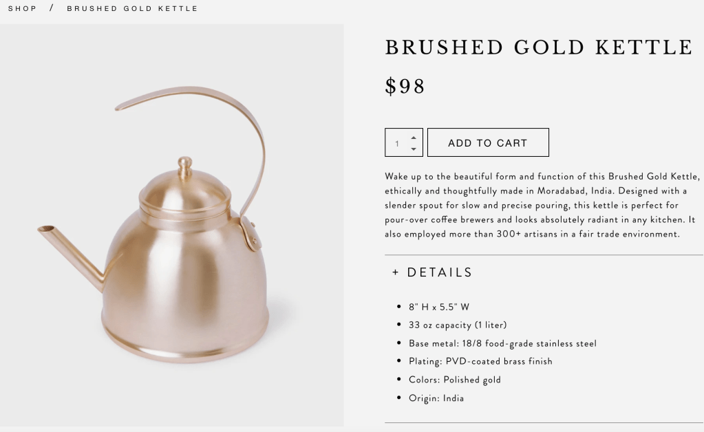 Okay, let me briefly talk about the product that I didn’t pick. The Brushed Gold Kettle really tempted me but both my husband and I are slobs in the kitchen. We drop things, forget to wash them right away and I have caused various fires doing basic things like boiling water. Needless to say, this was WAY too fancy for me and I didn’t want to see it die in my kitchen. But it is an AMAZING product.