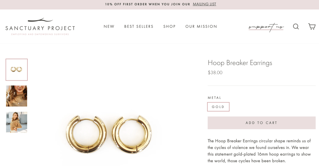 While I personally had no use for thick gold hoop earrings because I don’t wear gold colored jewelry, hoop earrings or any sensible earrings in general, I am obsessed with their message. I found them on Sanctuary Project right away: