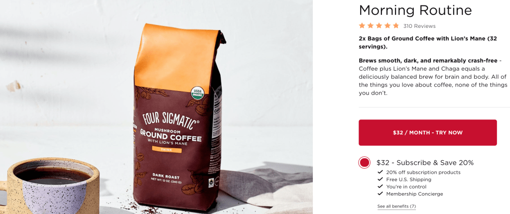 Four Sigmatic Mushroom Coffee makes your caffeine routine healthier! Mushrooms are a super food and can help you live your best life. Pick between regular coffee and products that help you focus, think or have more energy. Four Sigmatic is a great company and their mushroom coffee is both delicious and nutricious. Plus, they are reasonably priced and the health benefits are backed by science.