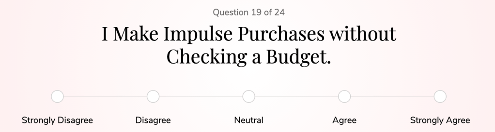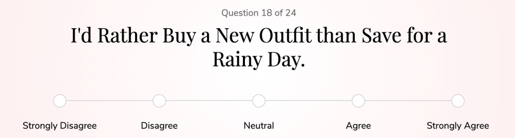 This is where I got suspicious about potential market research in this personality test. That and I felt ashamed of my answer. Learning to budget and save is high on my to-do list yet I never seem to get to it. Fast fashion is literally killing the planet. My only saving grace is that I shop second hand so the outfit will be new to me but pre-loved.