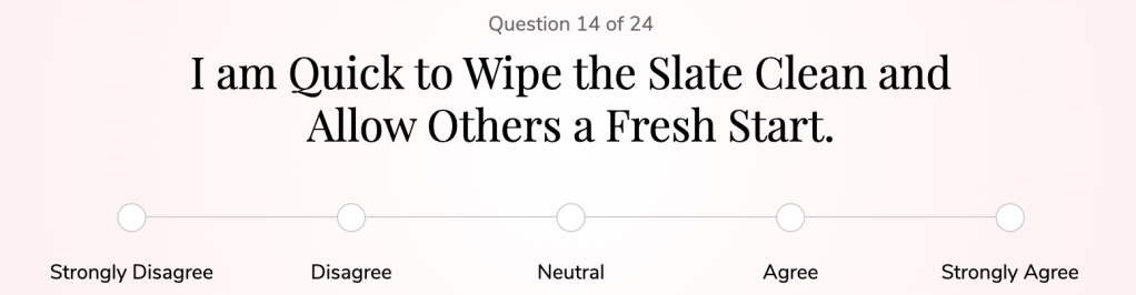 Another tough one… I am super forgiving but I never forget. Does it count as a clean slate if I remember the betrayals, lies, and deceit? I guess interpreting that is part of the persoanlity test.