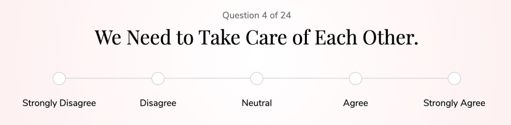 The phrasing of this one made me think. It doesn’t ask if you take care of others. It is asking if you believe in the statement that we should. I don’t know many people who would disagree but I guess it’s more about if you believe that we are a team supporting each other rather than focusing on yourself and not depending on anyone else.