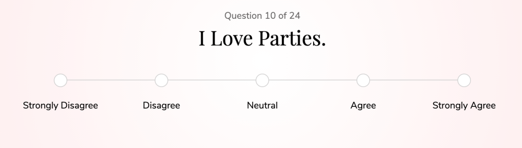 What kind of parties? There are SO many ways to have parties. I’m assuming they mean the kind of parties that I like, so I chose strongly agree. Who’s up for a themed costume party? I collect clothes and accessories for every occasion.