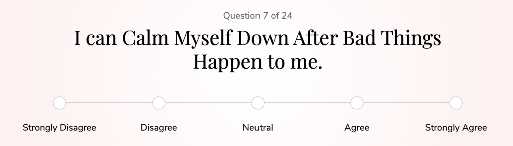 Yes, now I’m worrying about bad things happening to me. Thanks FabFitFun… and wow another hard question. What bad things? Slamming my hand in the door is a bad thing and I can calm myself down. Seeing a large spider in my bed is a bad thing and I will need to burn the bed to calm down. That thing I said that embarrassed me 20 years ago is a bad thing and it still makes me cry. I had to go neutral with this because bad things have a wide range of calmness attached to them.
