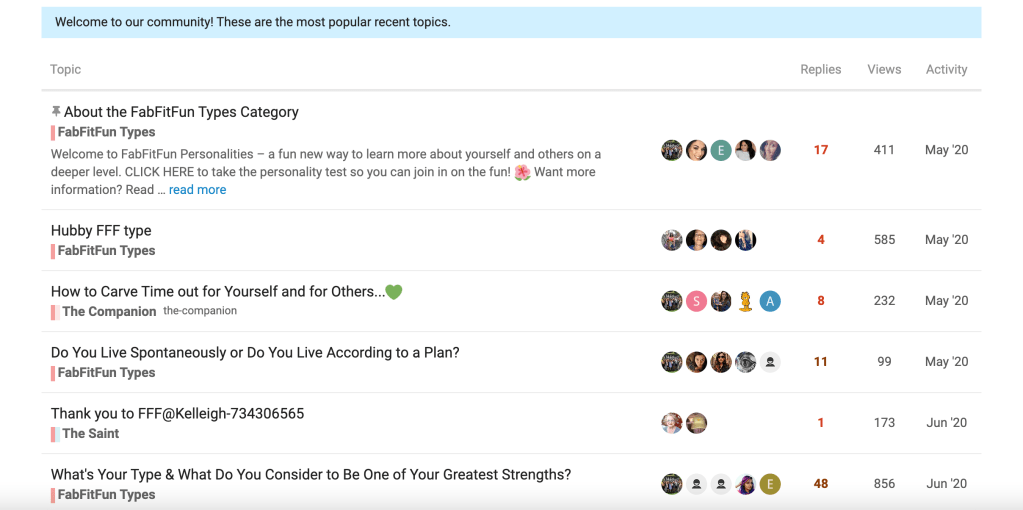 There are many ways that you can connect with other members. There are topics related to the FabFitFun Personality Test but also other topics. You can also bring up any other topic, as long as it is not inappropriate. This can be a great way to make like minded people!