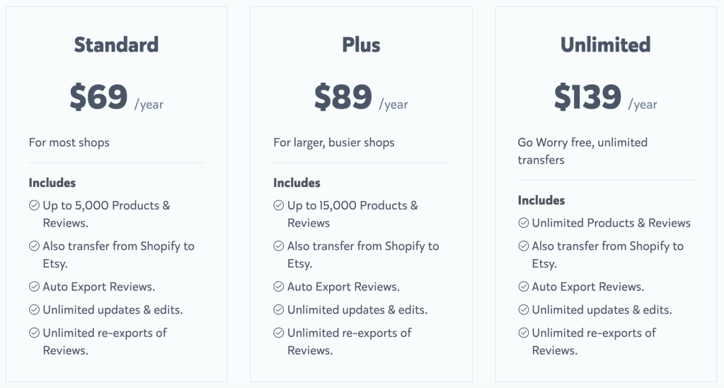 I originally paid $69, which lets you transfer up to 5,000 Products & Reviews. Since I have about 2,500 reviews and 600 items, I thought it would be enough. I clicked the wrong thing during transfer and ended up with all my items duplicated and it wasn’t clear which listing was the new one and which was the old one. This means that I had to check each one and delete the one I didn’t want to keep. This would have taken me days.