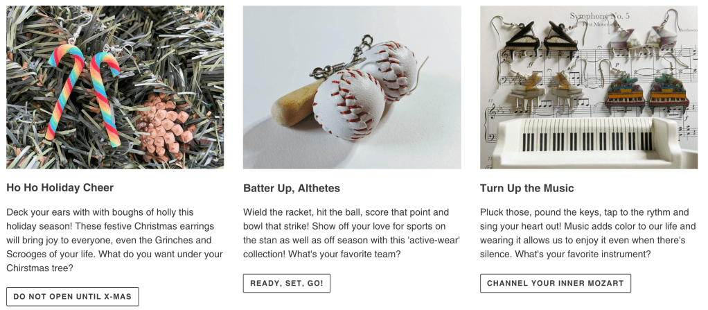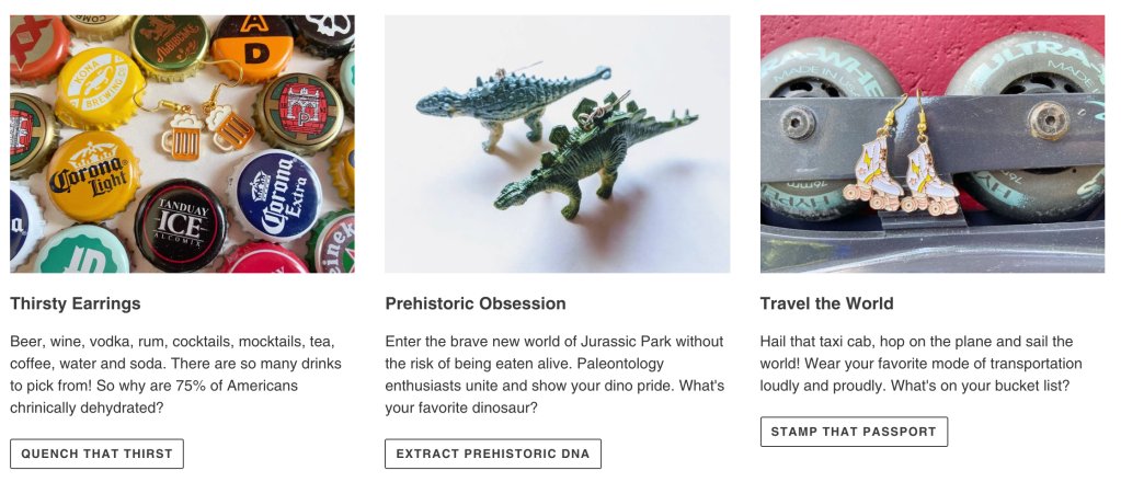 You won’t find fancy diamonds, fine metals, or even gems on our store. We sell fun, affordable earrings. We like to say that we take silly accessories seriously!