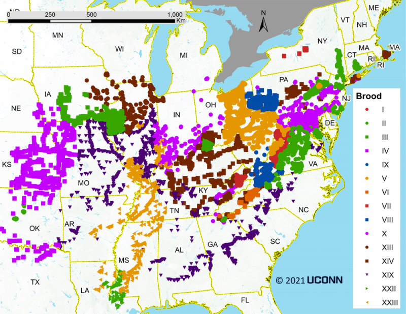 The map below from EarthSky shows where to expect the cicada swarm, color-coded based on the brood. There are perhaps 3,000 to 4,000 species of cicadas around the world, but the 13- and 17-year periodical cicadas are unique to eastern North America.