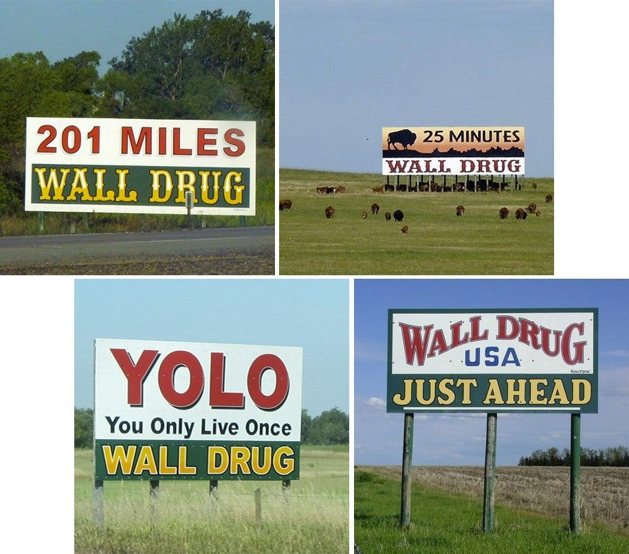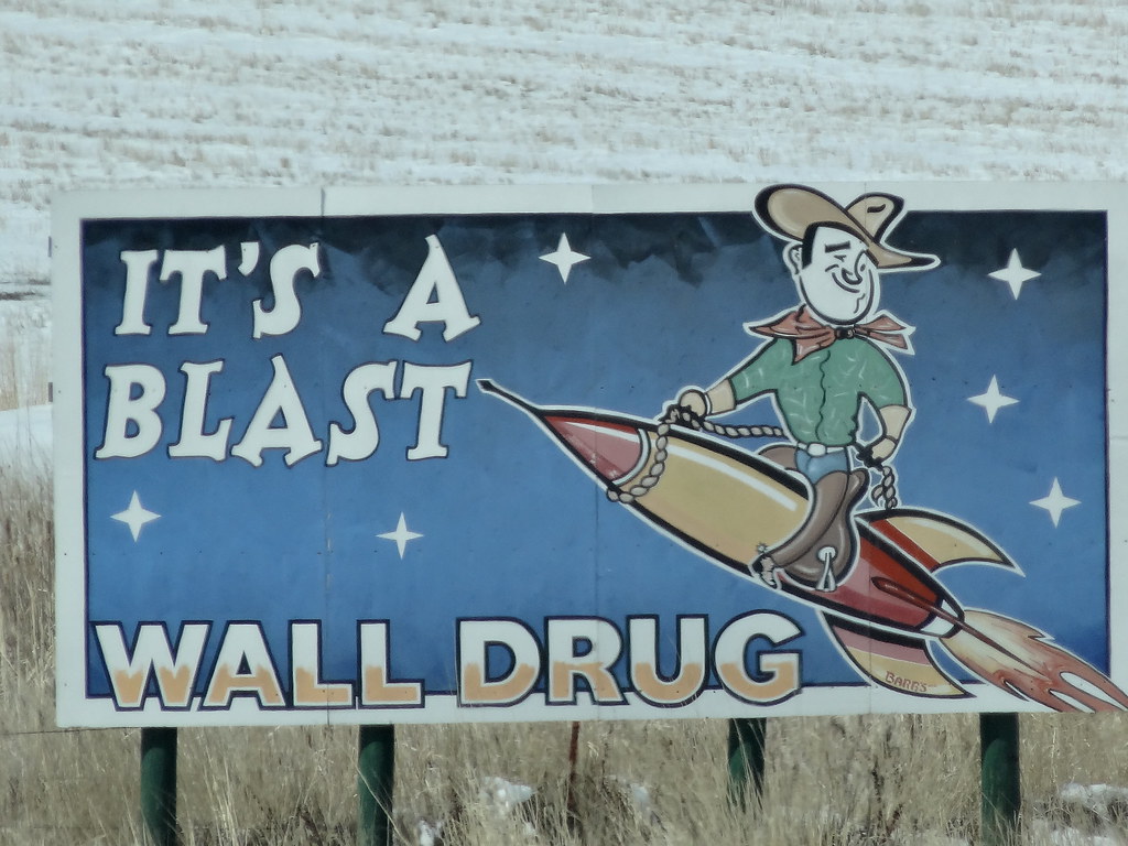 Although I haven’t personally seen them, there are supposedly Wall Drug signs in all 50 states and worldwide. Yes, there is literally a sign in Morocco telling people to go to a drug store in South Dakota. You can see some of the crazier signs here.