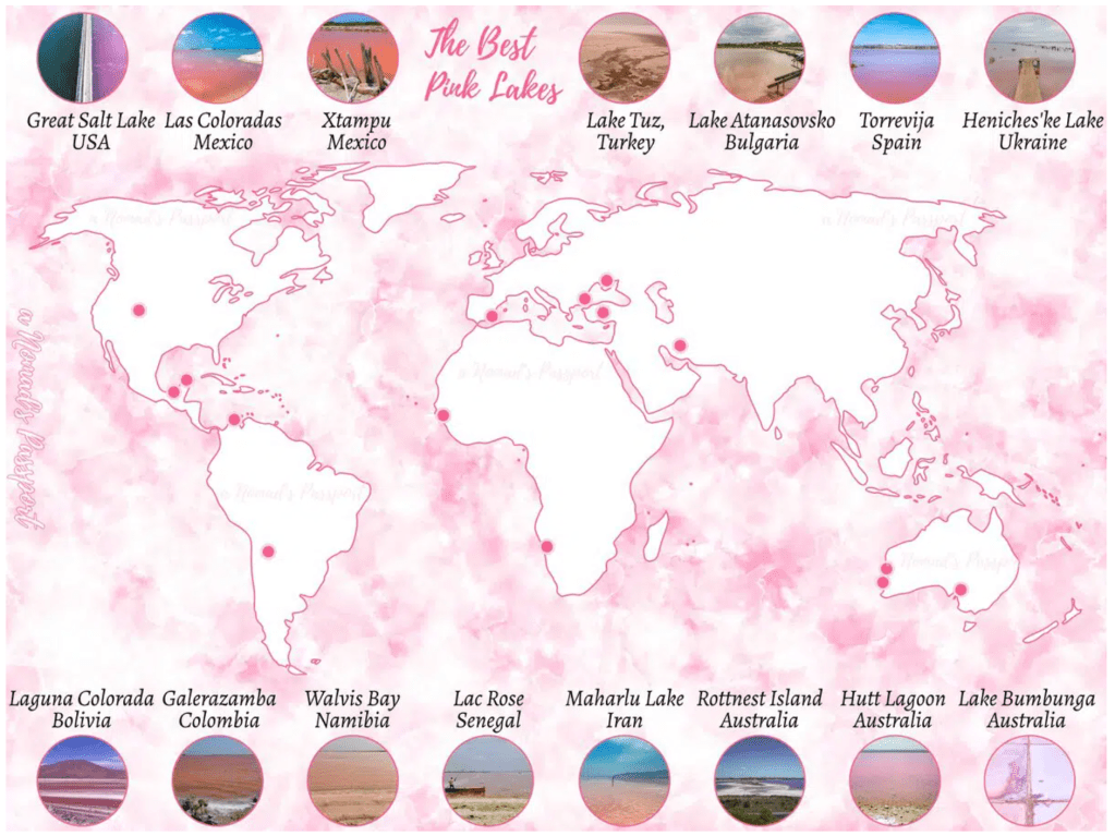 The photo below is from A Nomad Passport. Check out their article on pink lakes next! But don’t miss me explaining why they are pink below.