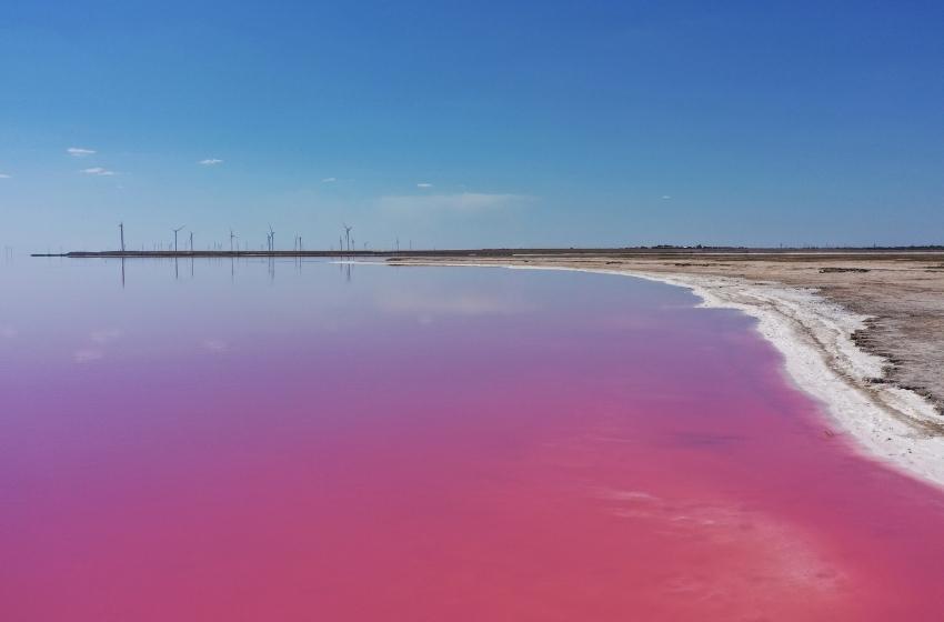 Our first pink lake is Lake Henichesk (Озеро Гені́чеськ), sometimes spelled Henyches’ke or even Genichesk, although this last one is based on the Russian pronunciation of this Ukrainian region. It is a salt lake with an internal drainage system, meaning the precipitation that falls within does not flow out but may only leave by evaporation and seepage.